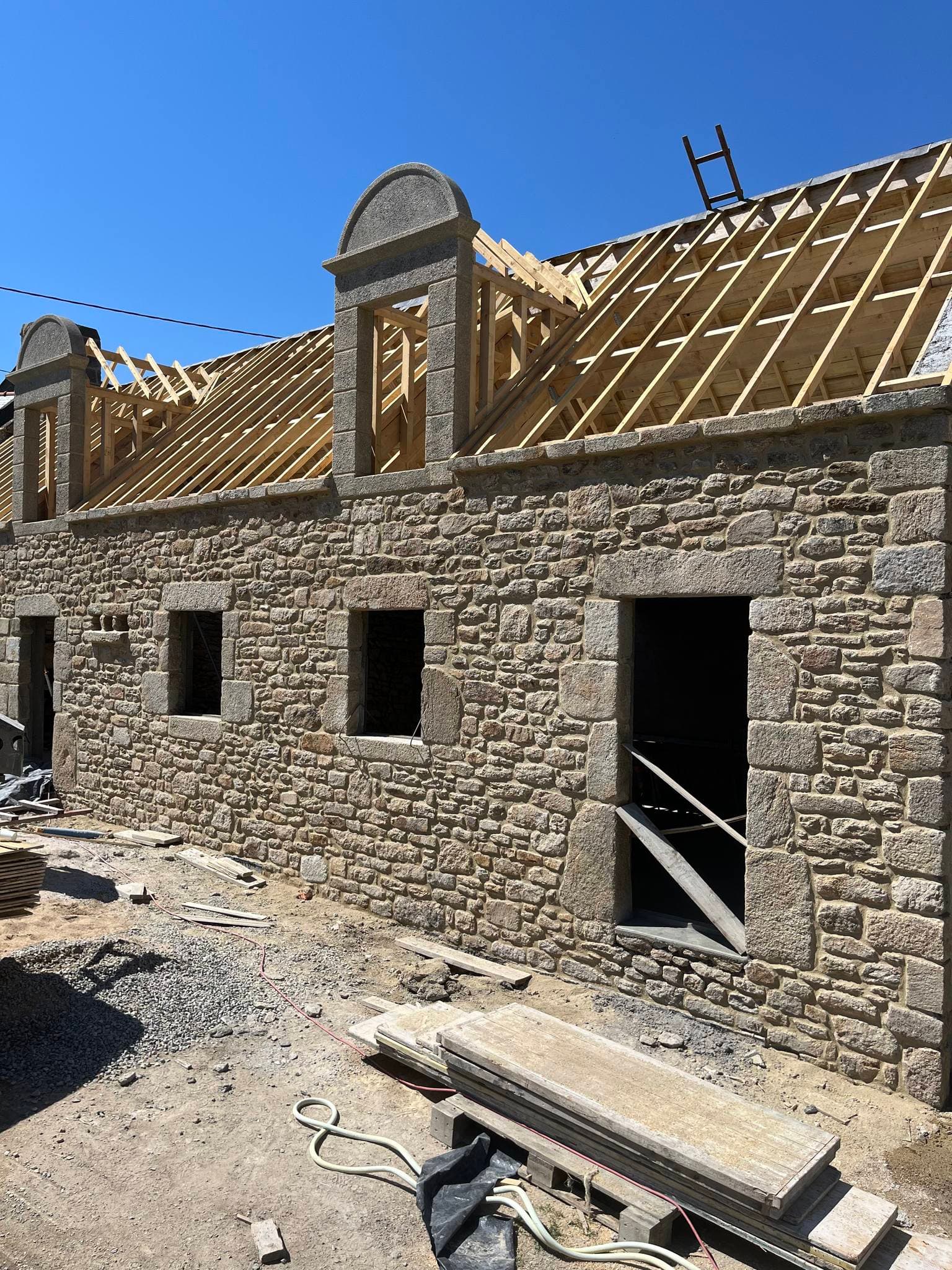 Restauration complète du bâti ancien en pierre : rejointement à la chaux, mise en valeur du granit apparent, réfection de crépi traditionnel. Nous redonnons vie aux longères bretonnes en respectant les techniques ancestrales et le caractère authentique du patrimoine.